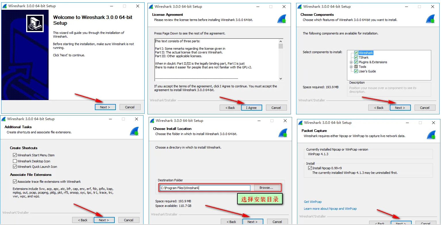 单击Wireshark-win64.exe右键以管理员身份运行,点击Next,点击 I Agree ;后面一直点击Next ;
